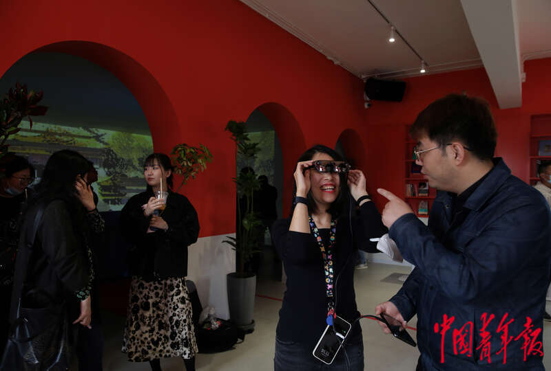 4月2日,北京新华书店·为宝书局,一位女士在工作人员的帮助下戴着VR眼镜,360°立体观看中轴线上的代表建筑——太庙。中青报·中青网记者 陈剑/摄