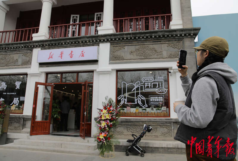 4月2日,北京新华书店·为宝书局外,一位女青年用手机拍摄书店的外观。中青报·中青网记者 陈剑/摄