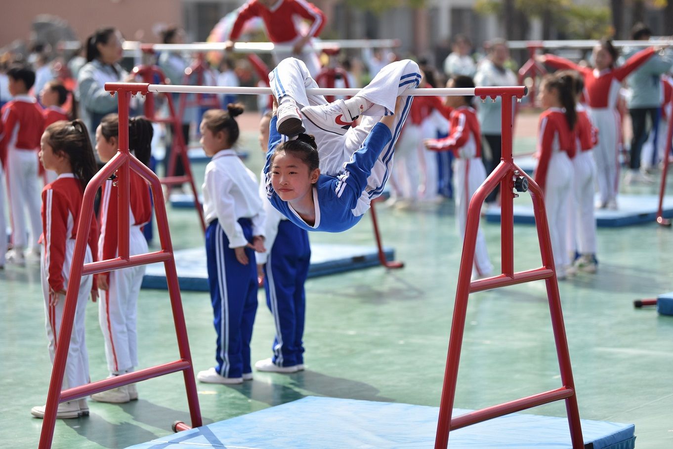 3月31日上午,江苏徐州柳新实验小学的操场上,当近3000名小学生和幼儿园的幼儿分别展示他们掌握的单杠运动技能时,现场观摩的来自徐州全市的百余位体育教研员、体育教师、校长们不禁发出阵阵惊叹声。单杠作为学生参与体育活动的主要器械之一,曾广泛分布于我国各级学校。但出于安全考虑,近30年来,单杠在国内小学已逐渐销声匿迹,能在单杠上轻松翻飞的小学生自然也难得一见。因此,当徐州市柳新实验小学的小学生和徐州市柳新镇9所幼儿园的幼儿们熟练地在单杠上悬垂、摆动、翻身时,观摩人员情不自禁地感慨起来。