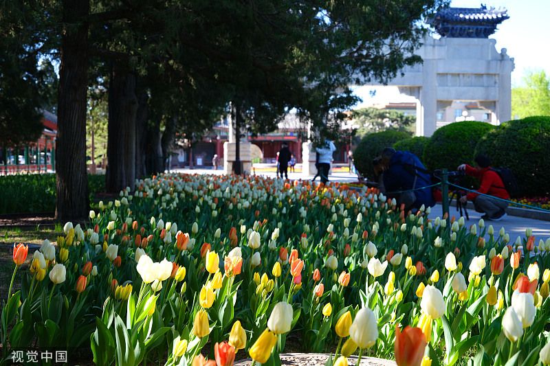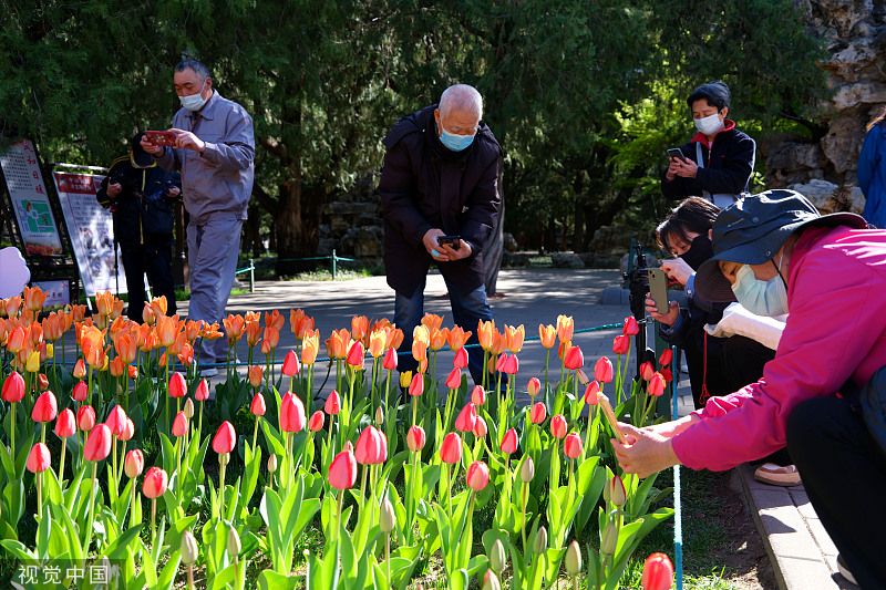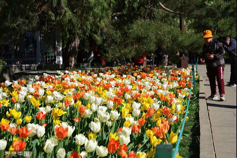 2023年4月7日,北京,中山公园85个品种、近20万株郁金香陆续绽放,盛开的郁金香摇曳生姿,吸引市民游客前往赏花拍照。(图片来源:视觉中国)