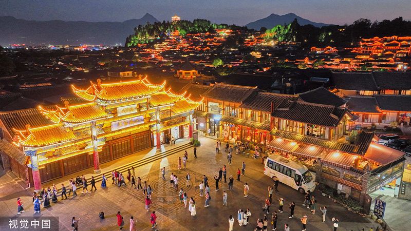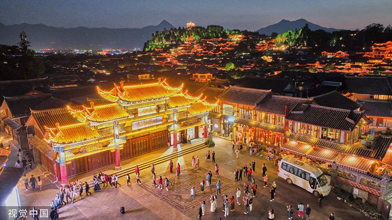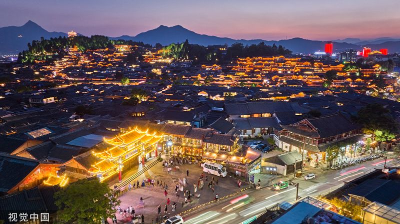 2023年4月18日晚,云南丽江古城,建筑灯光璀璨,游人络绎不绝。
