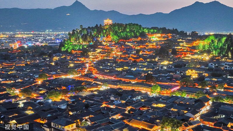 2023年4月18日晚,云南丽江古城,建筑灯光璀璨。