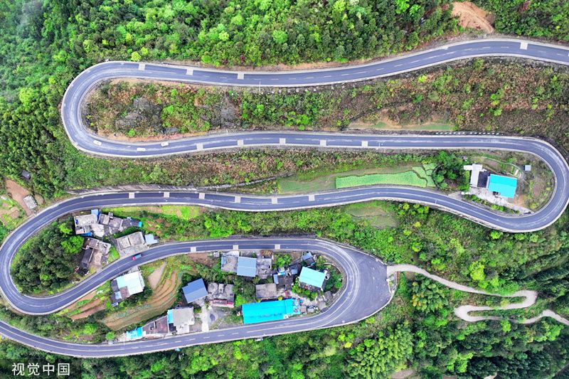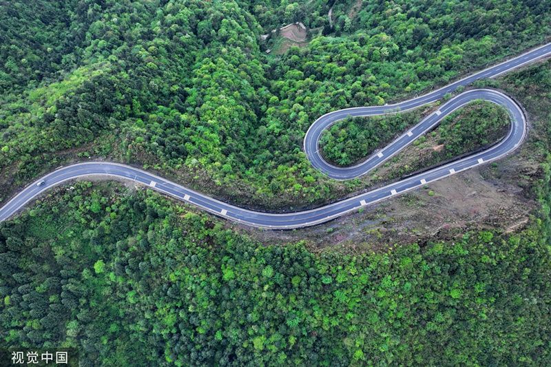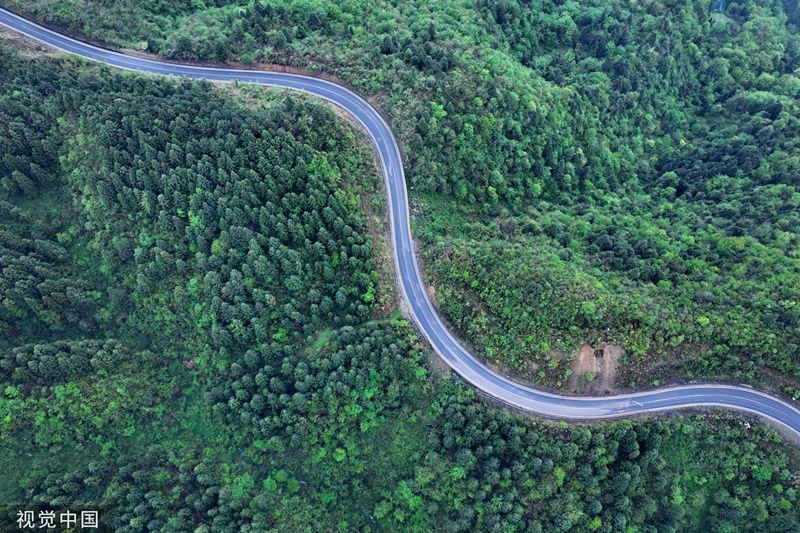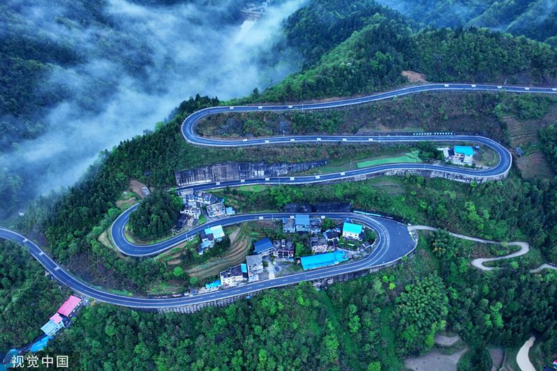2023年4月19日,重庆,酉阳土家族苗族自治县涂市镇大杉村,云雾下的盘山公路蜿蜒盘旋,宛如玉带绕山间。