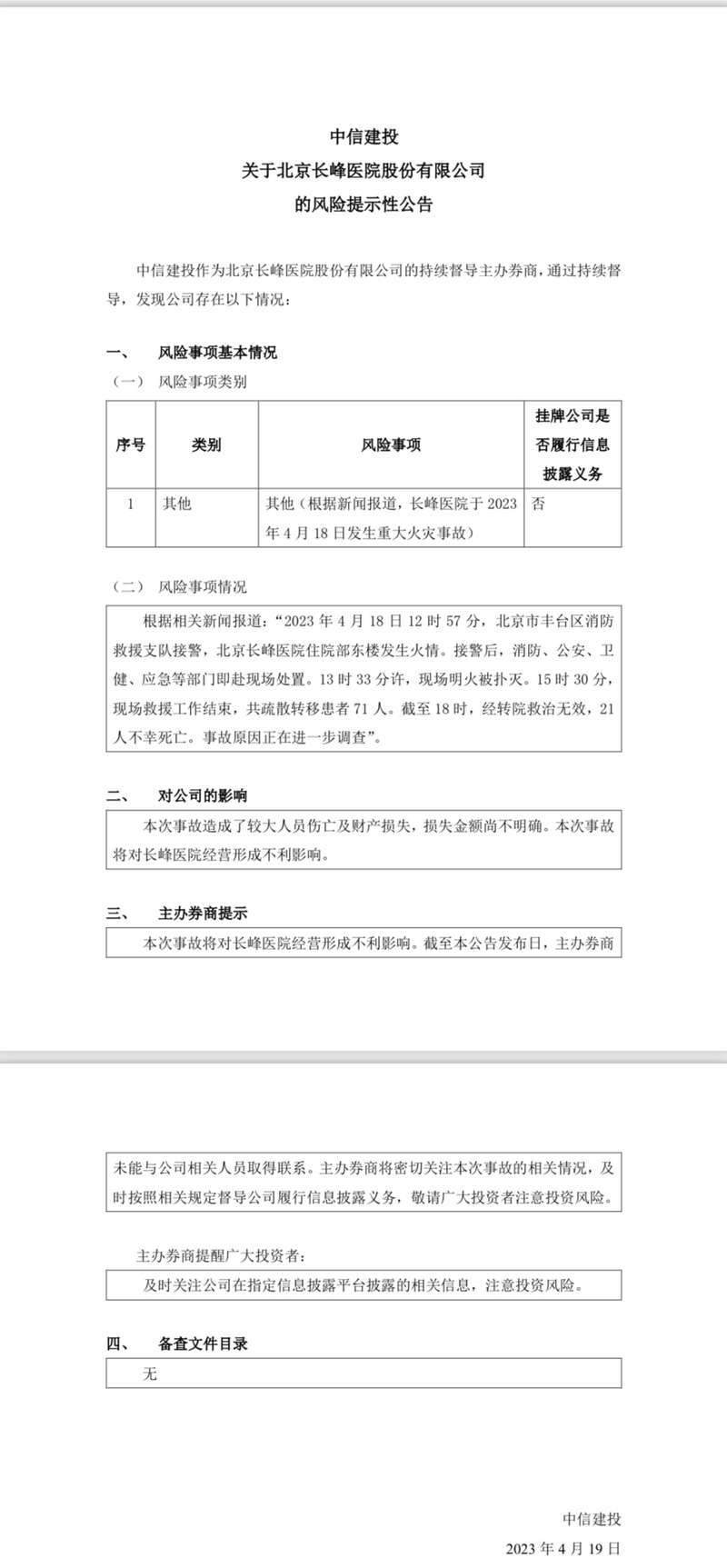 作为该公司持续督导主办券商,中信建投于19日发布《关于北京长峰医院股份有限公司的风险提示性公告》称,根据相关新闻报道,长峰医院于2023年4月18日发生重大火灾事故。本次事故造成了较大人员伤亡及财产损失,损失金额尚不明确。本次事故将对长峰医院经营形成不利影响。截至公告发布日,主办券商未能与公司相关人员取得联系。主办券商将密切关注本次事故的相关情况,及时按照相关规定督导公司履行信息披露义务,敬请广大投资者注意投资风险。