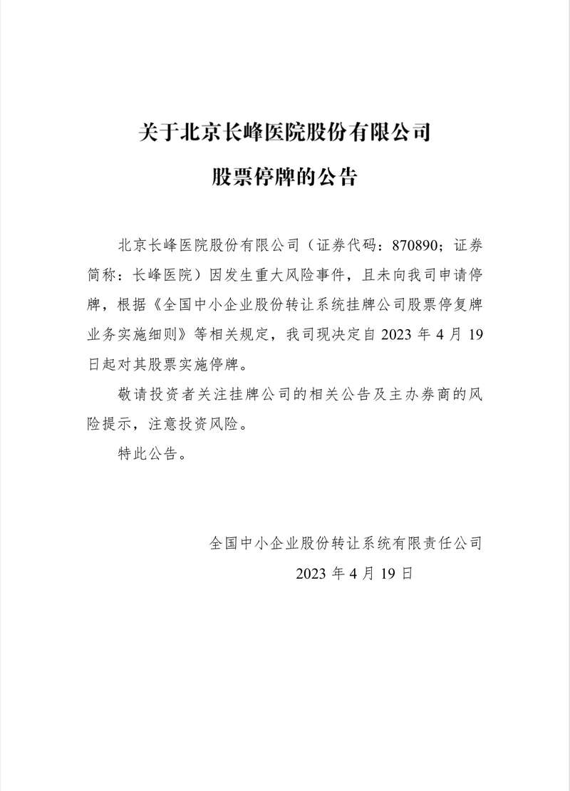 中国青年报客户端北京4月19日电(中青报·中青网记者 宁迪)全国中小企业股份转让系统今天发布公告,北京长峰医院股份有限公司因发生重大风险事件,且未申请停牌,根据《全国中小企业股份转让系统挂牌公司股票停复牌业务实施细则》等相关规定,决定自2023年4月19日起对其股票实施停牌。