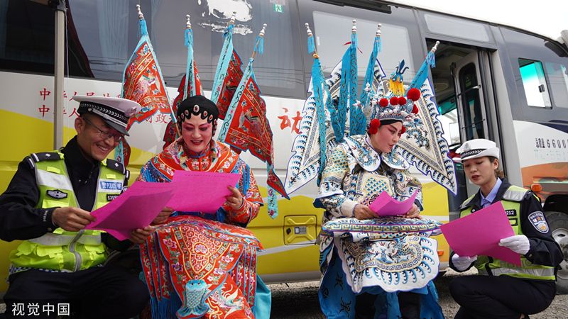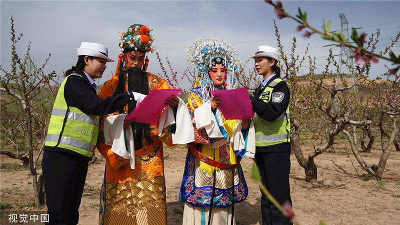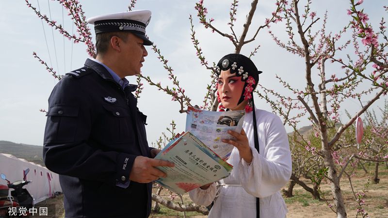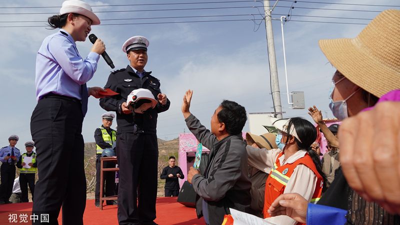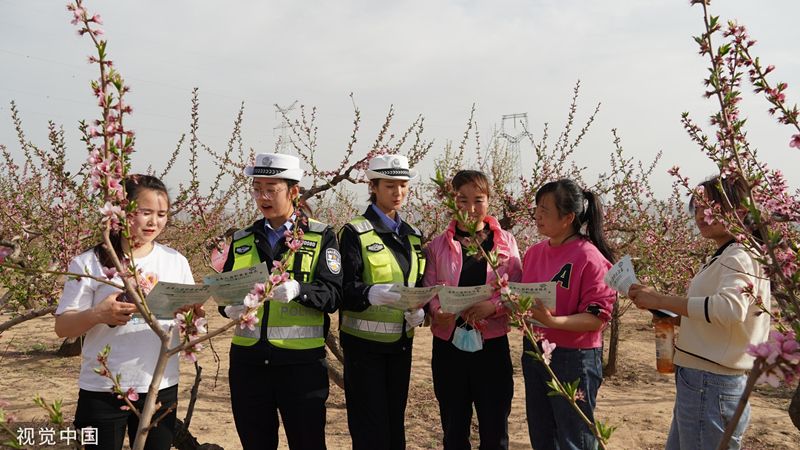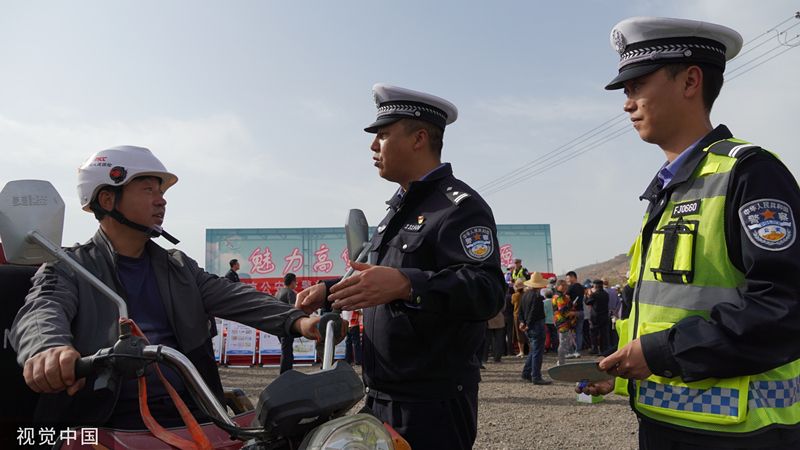 2023年4月18日,甘肃平凉,民警宣传交通安全知识。
