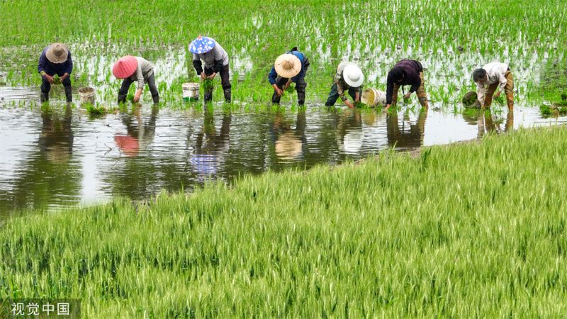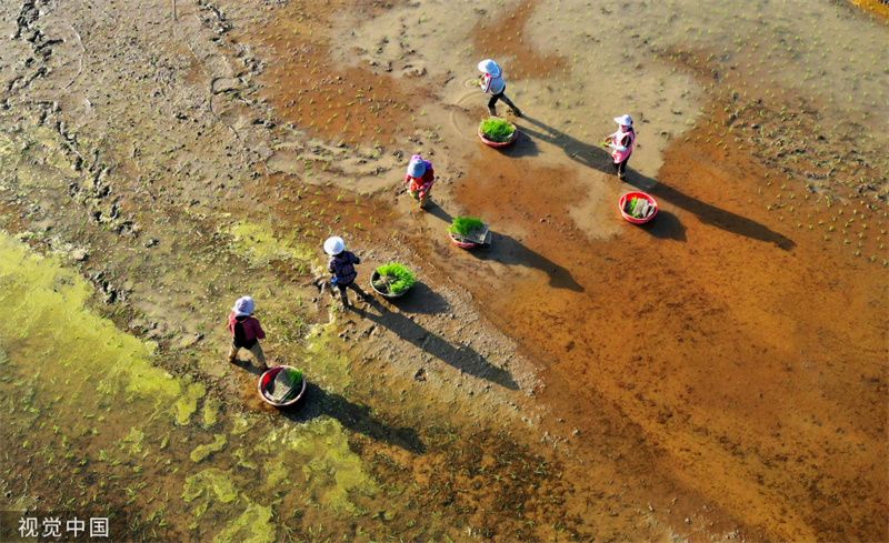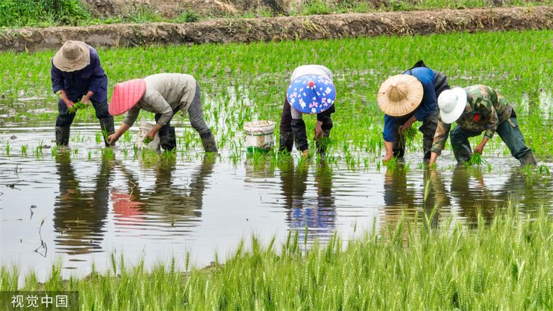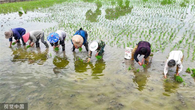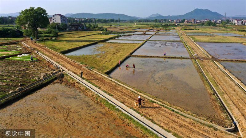 2023年5月4日,江西省吉安市,永丰县潭城乡舍陂村高标准农田里,农民正在抢插水稻秧苗。