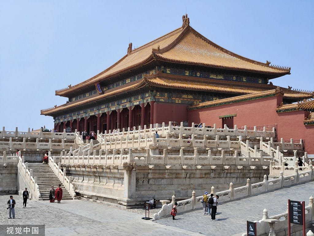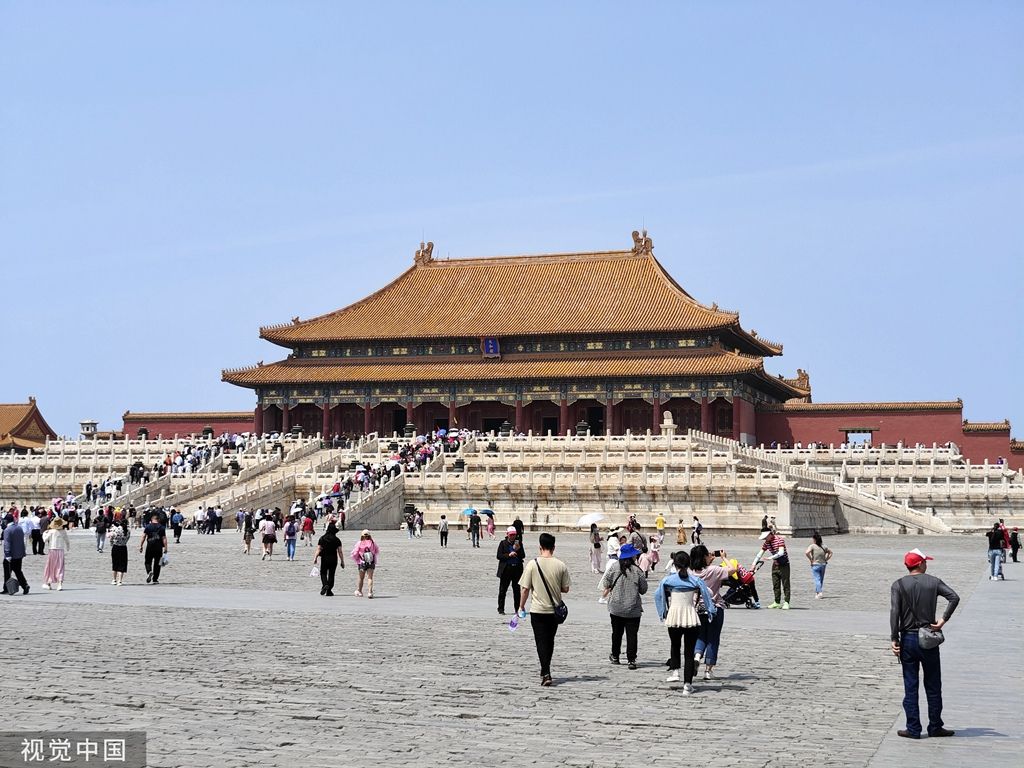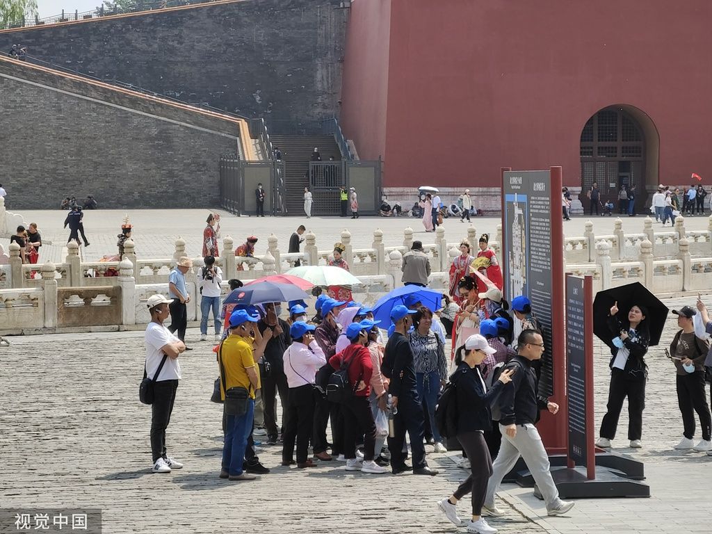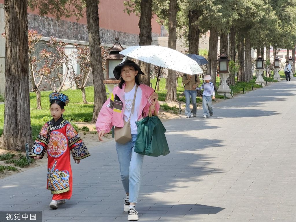2023年5月10日,北京,立夏后气温升高,故宫内游客打伞游玩拍照。