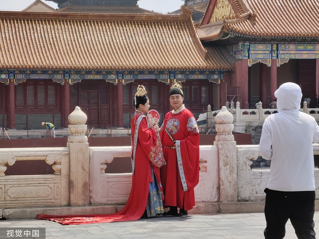 2023年5月10日,北京,立夏后气温升高,故宫内游客拍古装照片。