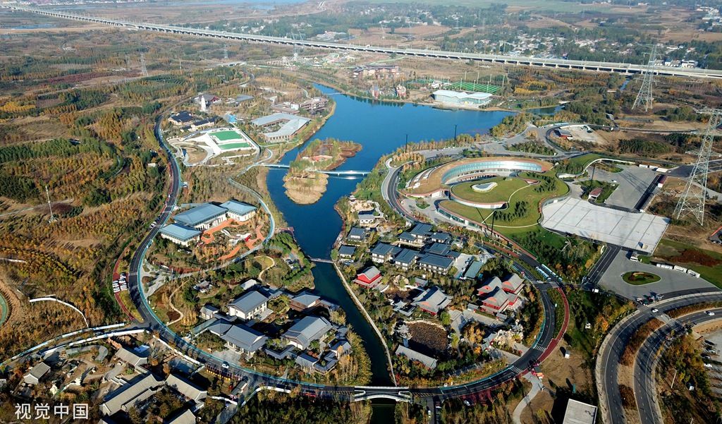 2022年10月31日,河北雄安新区,航拍郊野公园秋景。“未来之城”雄安新区城市功能不断完善,城市雏形全面显现,承接北京非首都功能疏解工作有序进行,重点片区和重大项目建设稳步推进,生态环境保护成效显著……这里正系统谋划中国式现代化雄安场景。 中新社记者 韩冰 摄