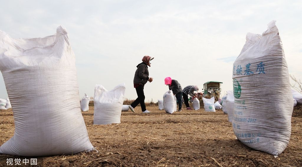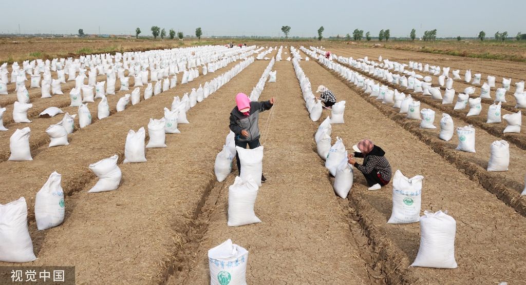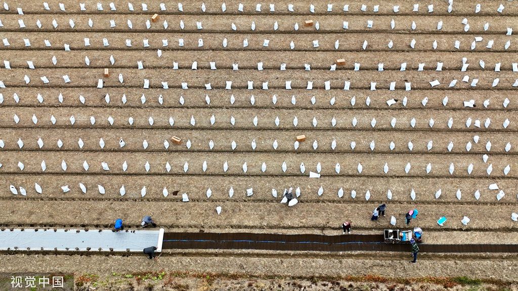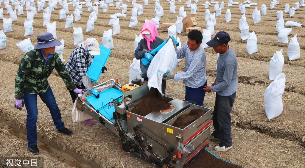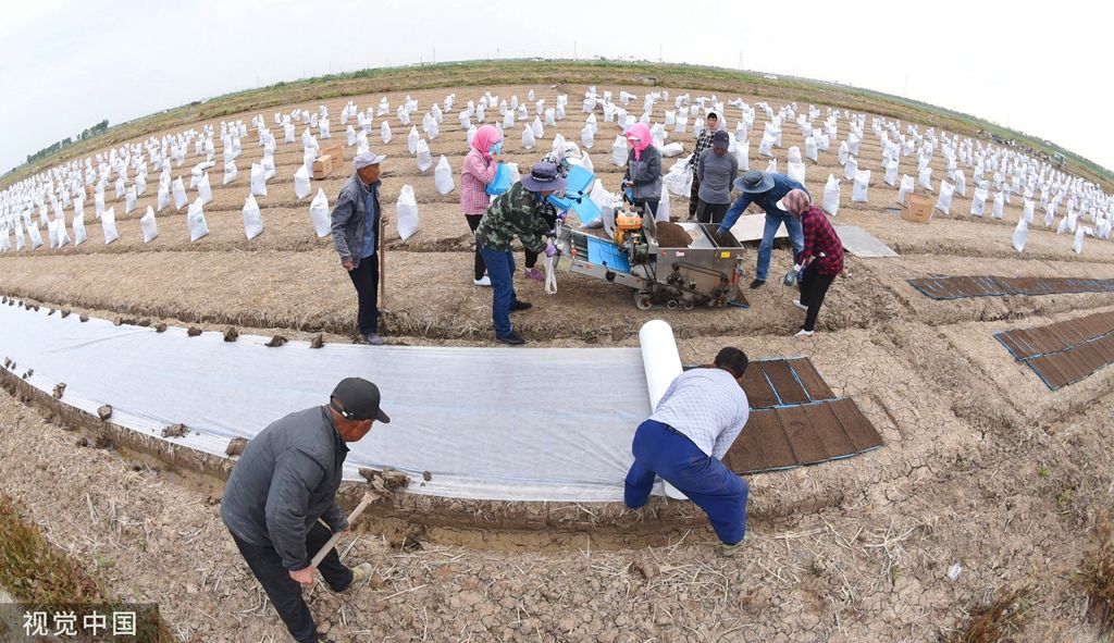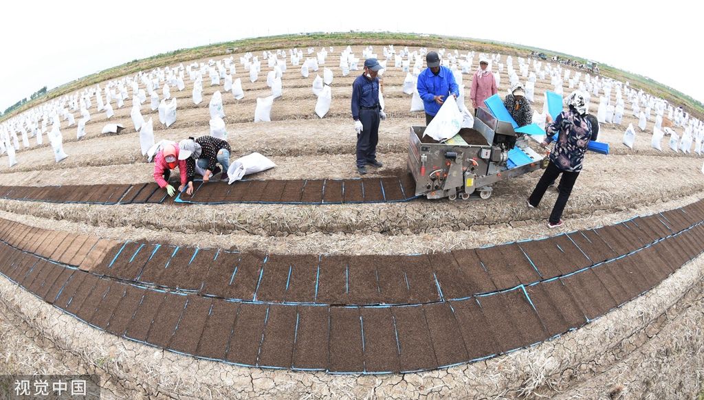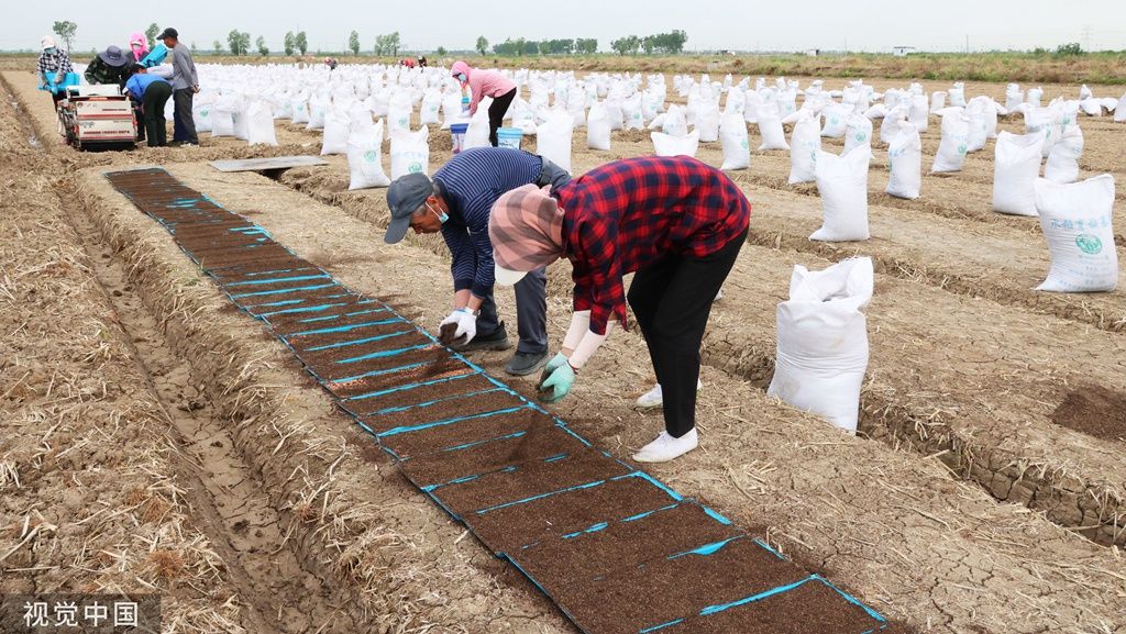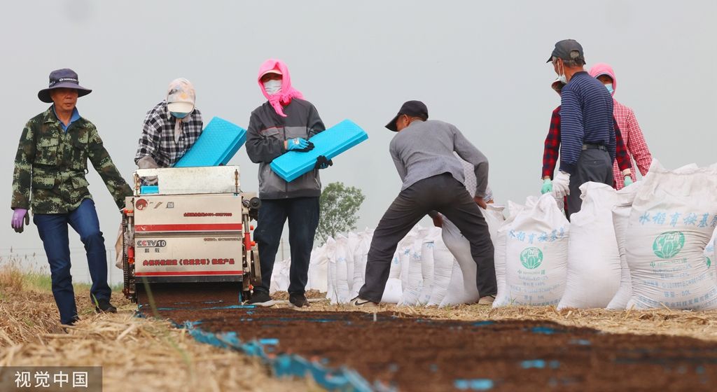 2023年5月10日,江苏省连云港市工投集团青口投资有限公司大新农场秧板田里,种植户正在进行耐盐碱水稻集中育秧作业。