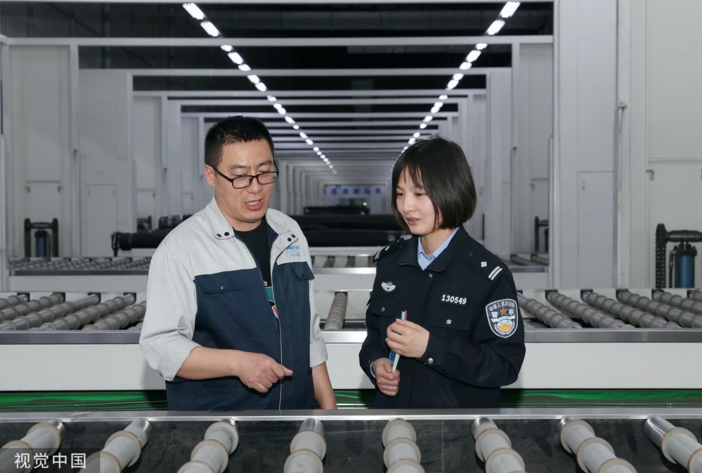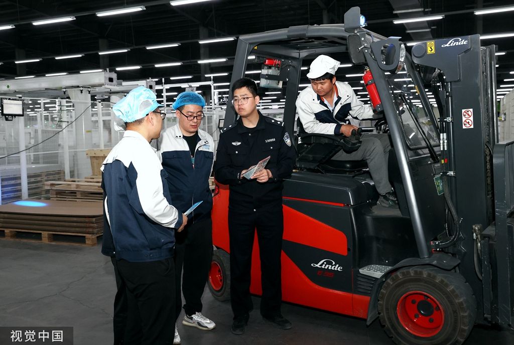 2023年5月10日,江苏省宿迁市公安局经济技术开发区分局组织民警在企业提醒员工安全规范操作设备。