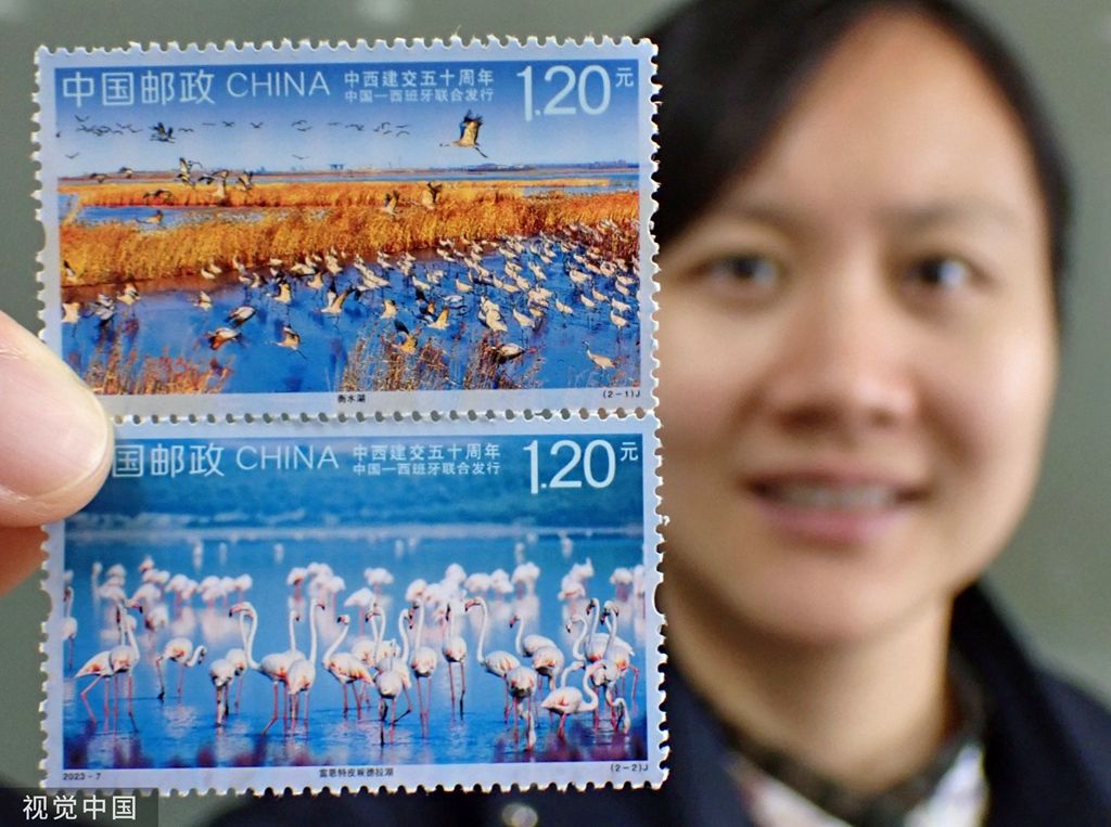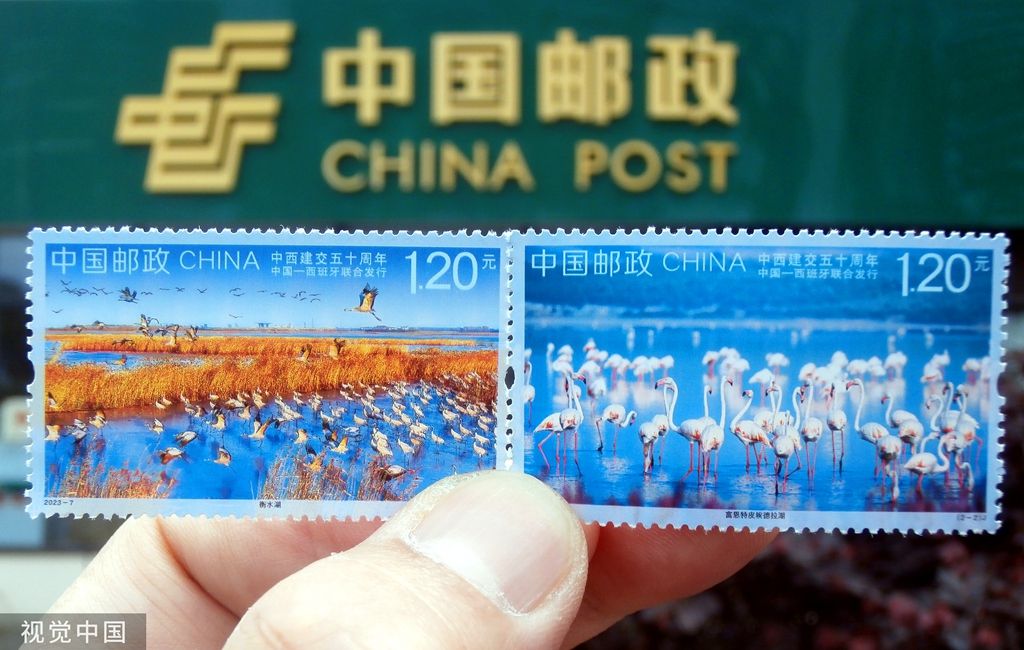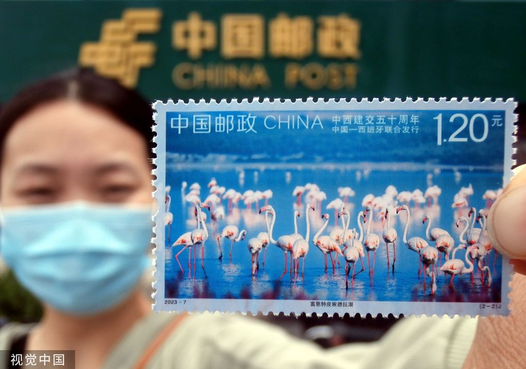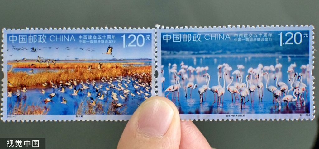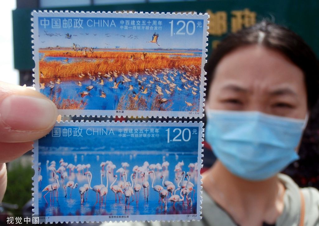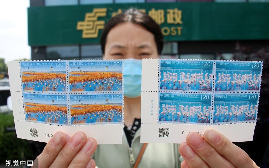 2023年5月10日,市民在江苏省张家港市邮政局展示购买的《中西建交五十周年》纪念邮票。