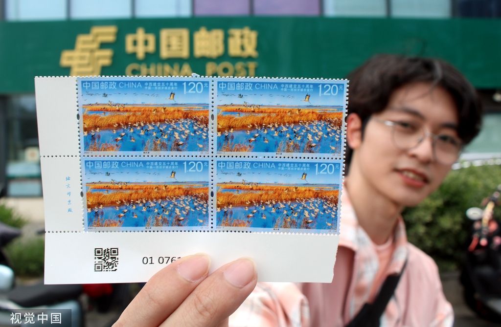2023年5月10日,一名集邮爱好者在苏州邮政局展示刚购买的《中西建交五十周年》纪念邮票。