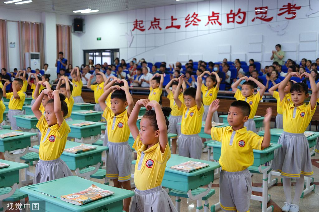 2023年6月12日,河北保定,涞水县西关小学的同学们为社会爱心人士表演“三姿韵律操”。
