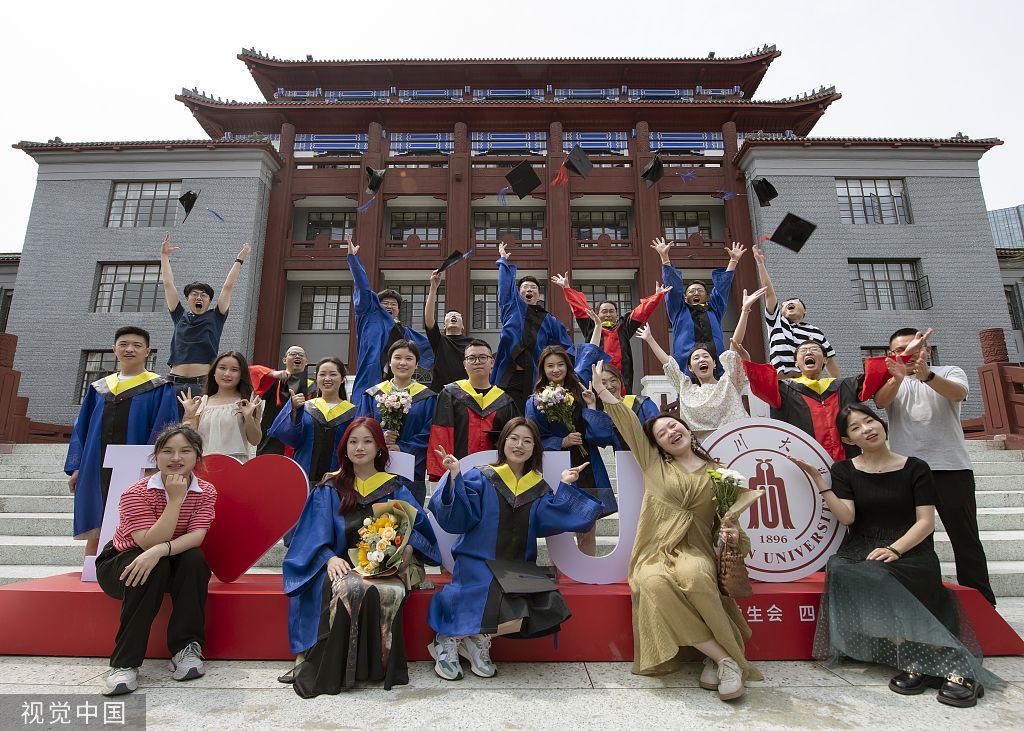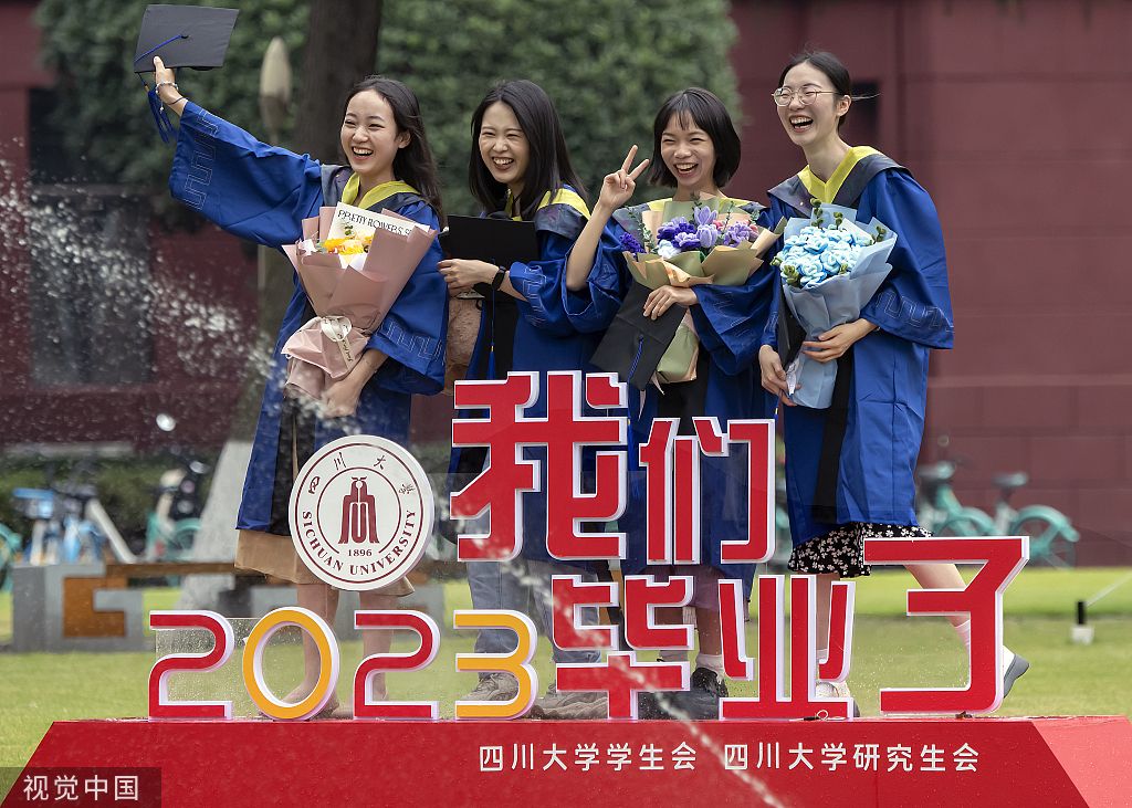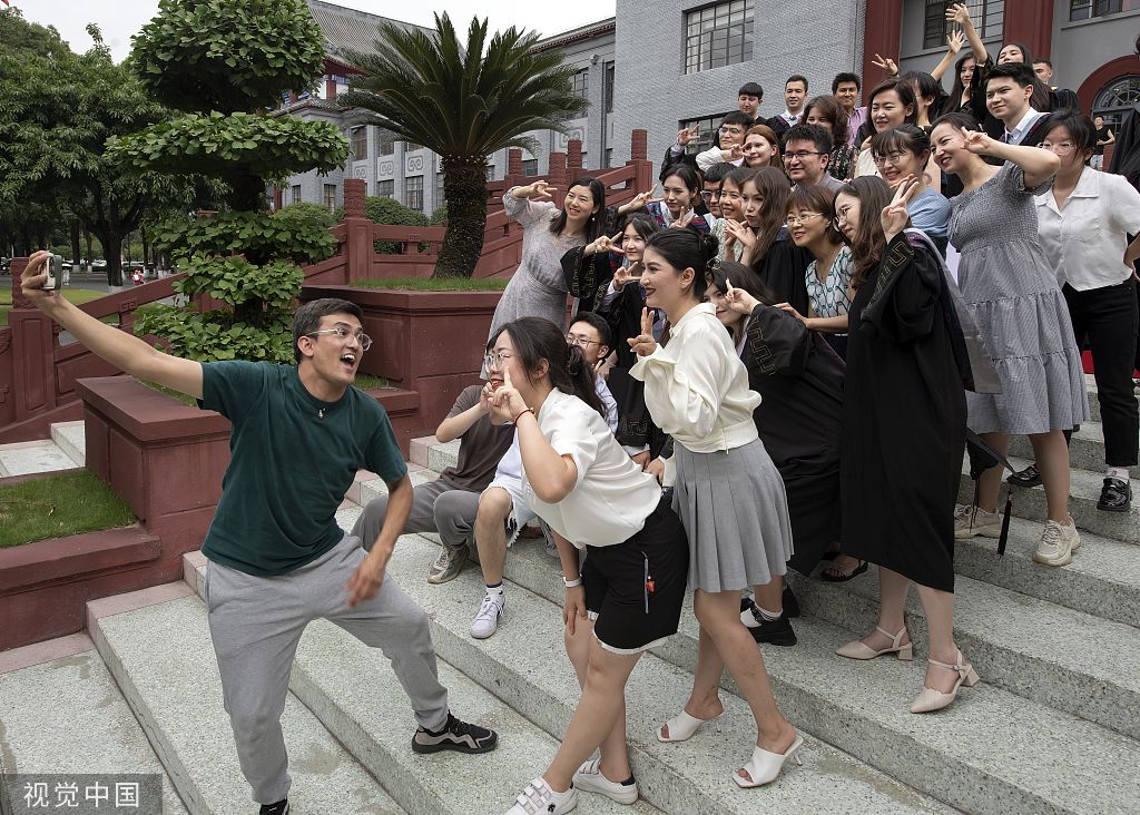 2023年6月13日,成都,四川大学,毕业生们与同学或亲朋好友一起,在学校办公楼、各学院门前等拍照纪念。