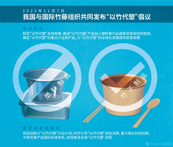 王永刚表示,目前世界主要经济大国和人口大国都在大幅度禁止、限制、替代塑料制品使用。2022年11月,中国政府同国际竹藤组织共同发起“以竹代塑”倡议,在全球推动以竹子代替塑料产品的合作,推动减少塑料污染,为塑料污染问题提供了基于自然的东方解决方案。