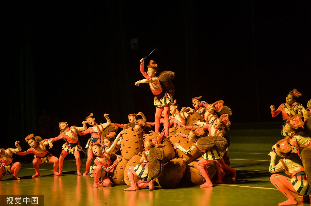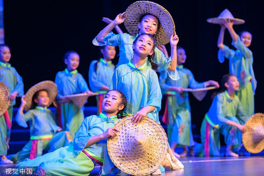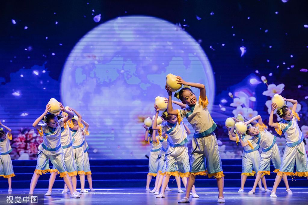 2023年6月14日,江西吉安,新干县第十四届校园文化艺术节上,学生正在表演舞蹈《排排坐,吃果果》。