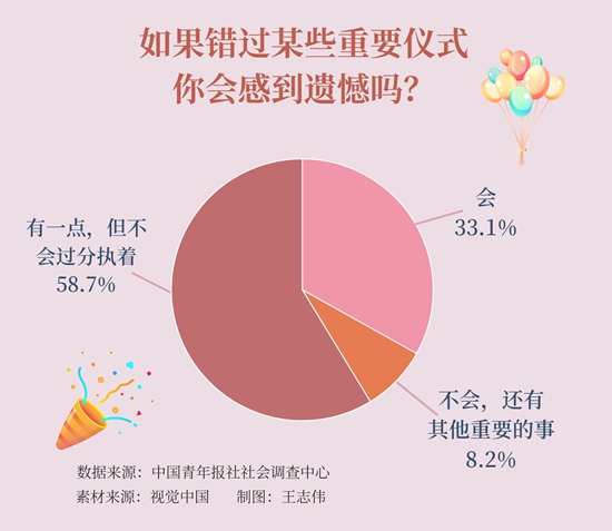 调查显示,如果错过了人生中的某些重要仪式,33.1%的受访青年会感到遗憾,58.7%的受访青年表示有一点遗憾,但不会过分执着,8.2%的受访青年表示不会遗憾,人生中还有其他重要的事情。