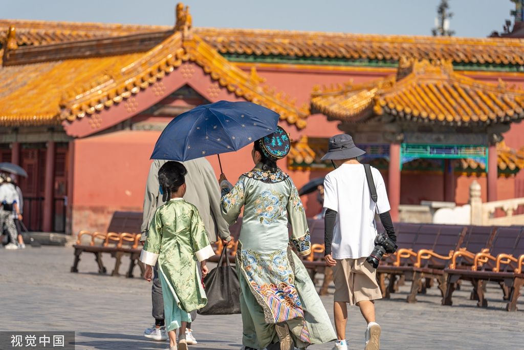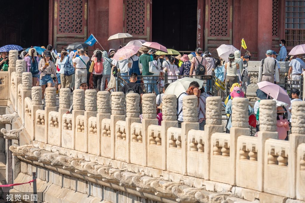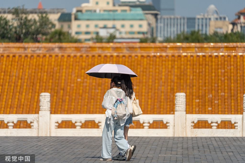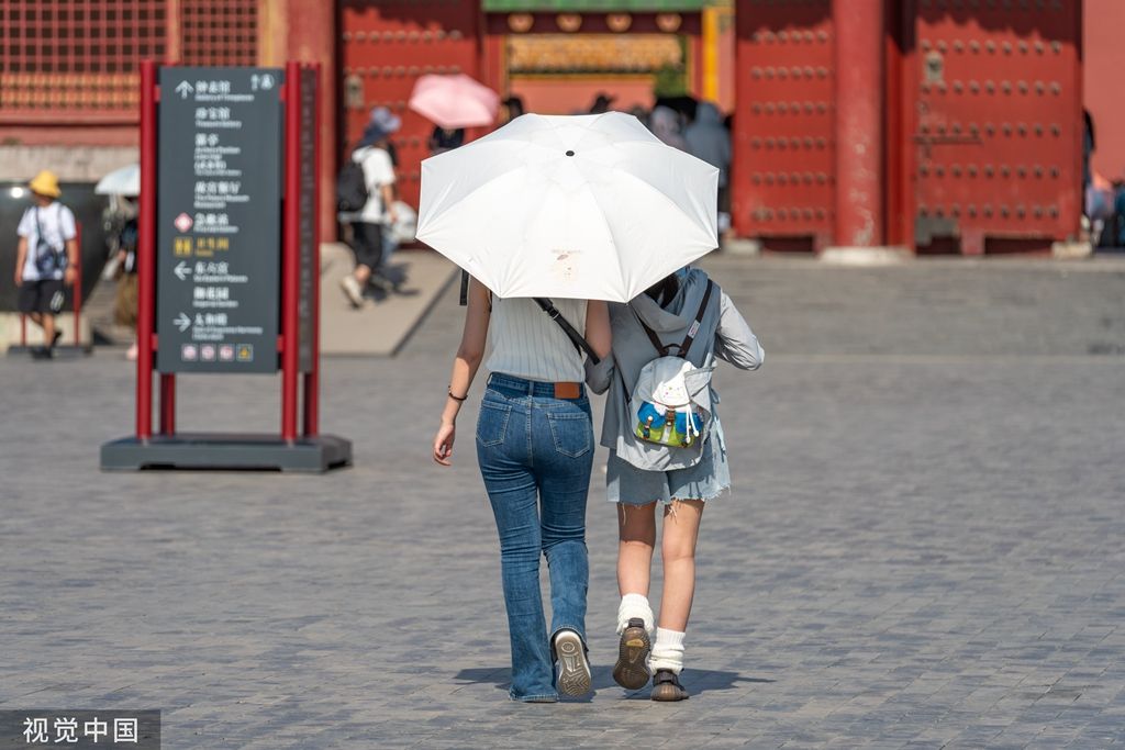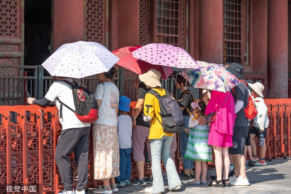 2023年6月24日,北京,端午40度高温天气,游客在烈日炙烤中撑伞游览故宫。