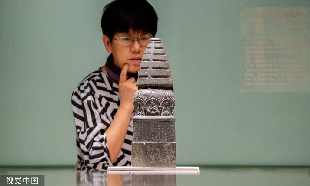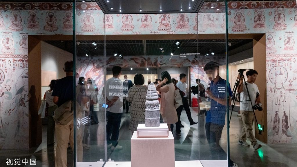 2023年7月12日,“2023丝绸之路周”活动在杭州启动,“文明大观——丝绸之路上的敦煌”主题展览也同时在中国丝绸博物馆开启。活动上展出的北凉高善穆石塔。