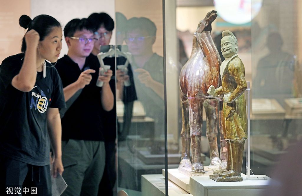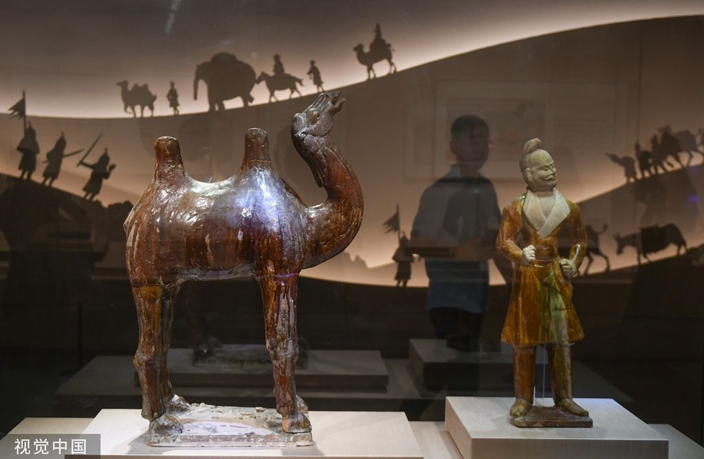 2023年7月12日,杭州,参观者观看展出的三彩骆驼(左)、三彩牵驼俑等文物。 中新社记者 王刚 摄
