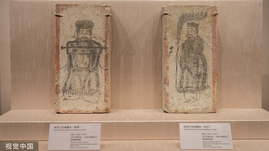 2023年7月12日,“2023丝绸之路周”活动在杭州启动,“文明大观——丝绸之路上的敦煌”主题展览也同时在中国丝绸博物馆开启。西晋门吏画像砖。