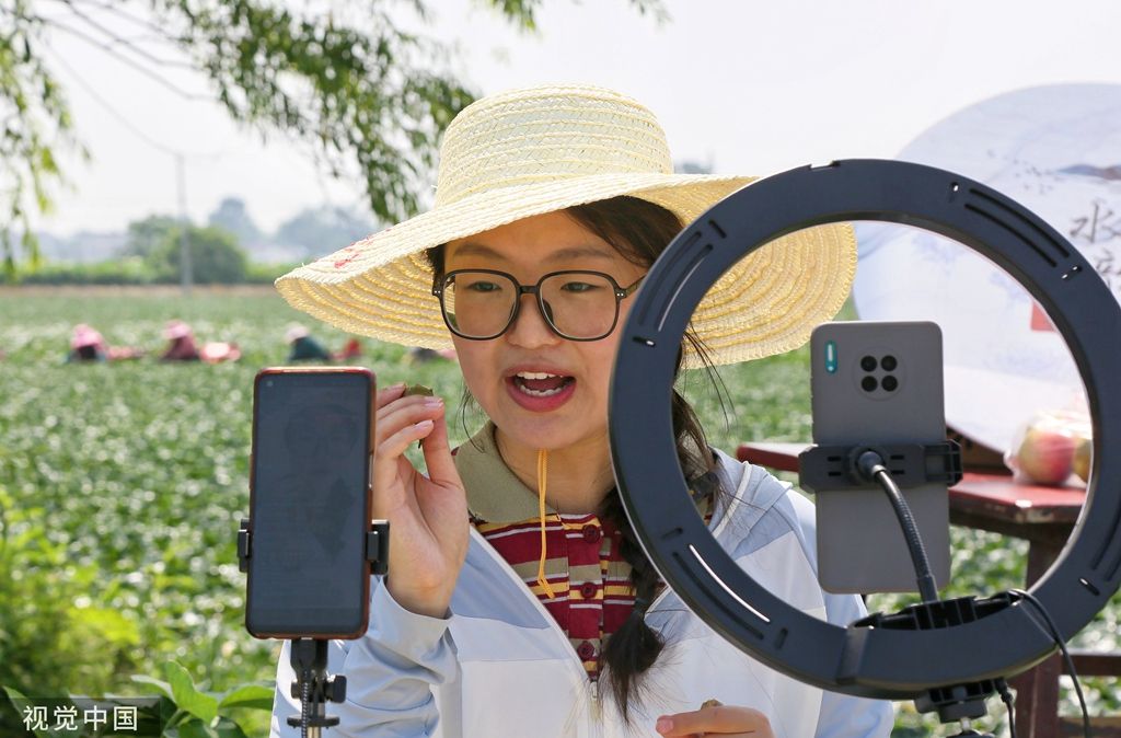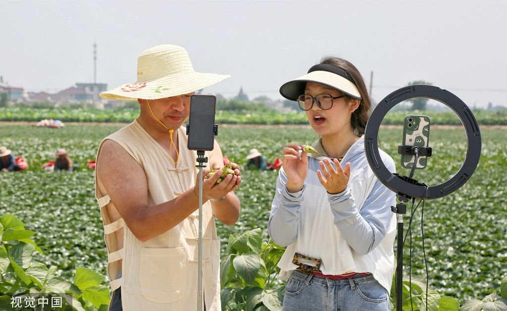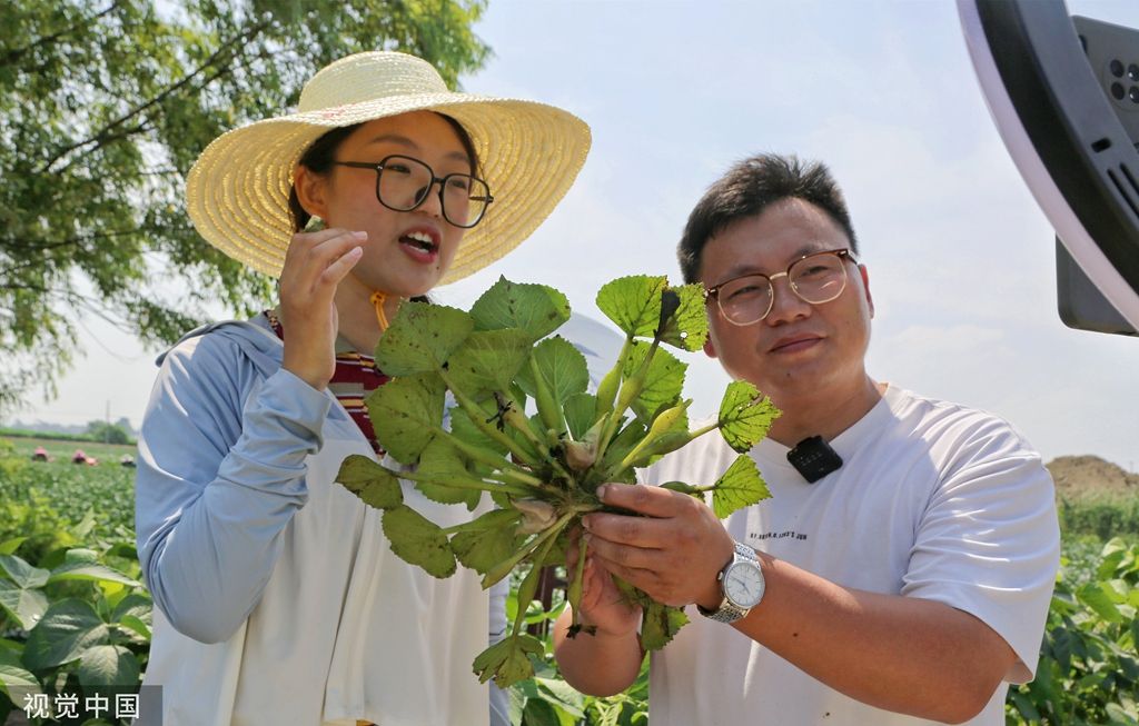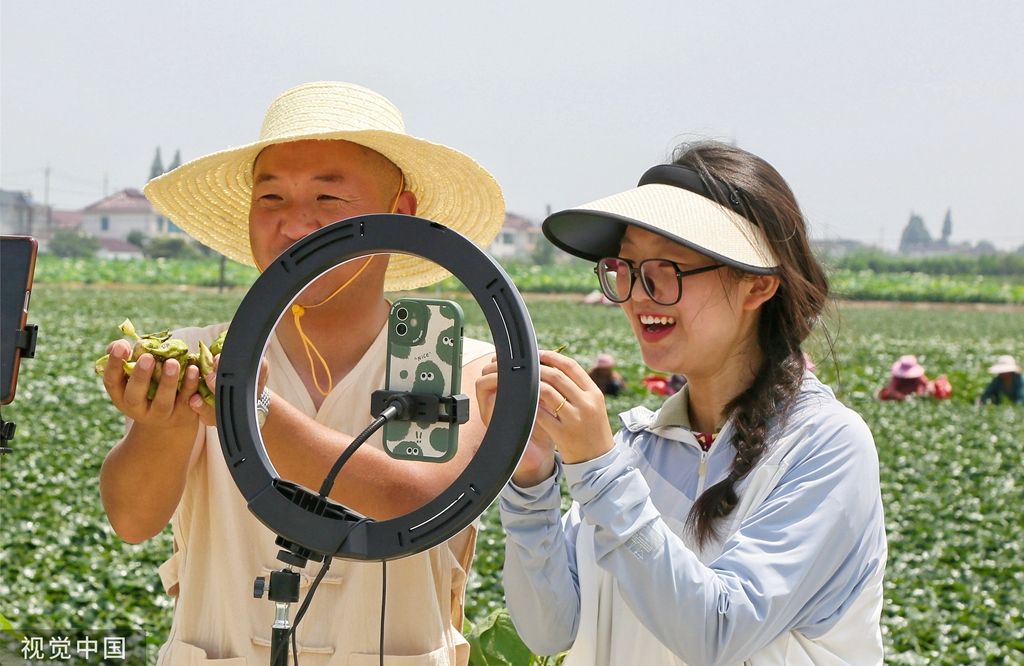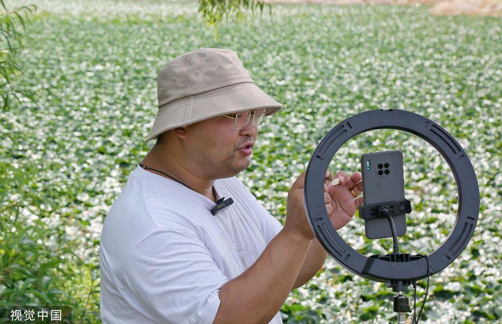 2023年8月11日,江苏南通,海安市墩头镇农社局工作人员在新舍村菱角种植基地直播推销菱角等农产品。
