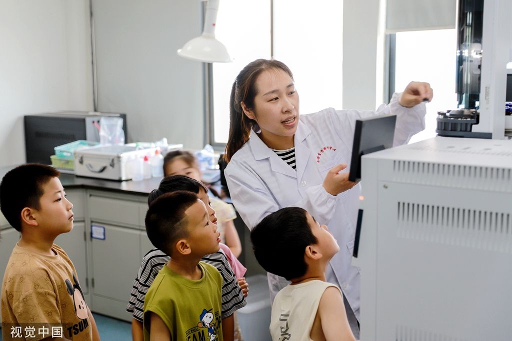 2023年8月11日,浙江湖州,长兴县食品药品检验检测中心实验室,工作人员向同学们介绍检验仪器设备的工作原理。