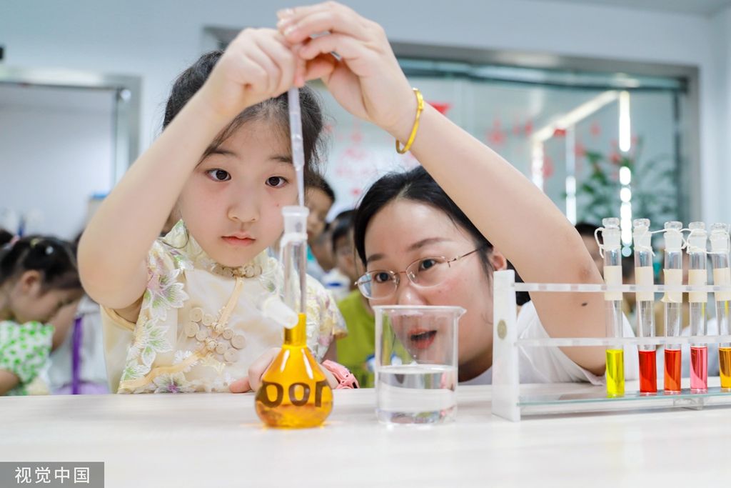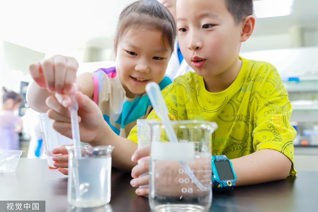 2023年8月11日,浙江湖州,长兴县食品药品检验检测中心实验室,小朋友在工作人员指导下进行定容科普实验。