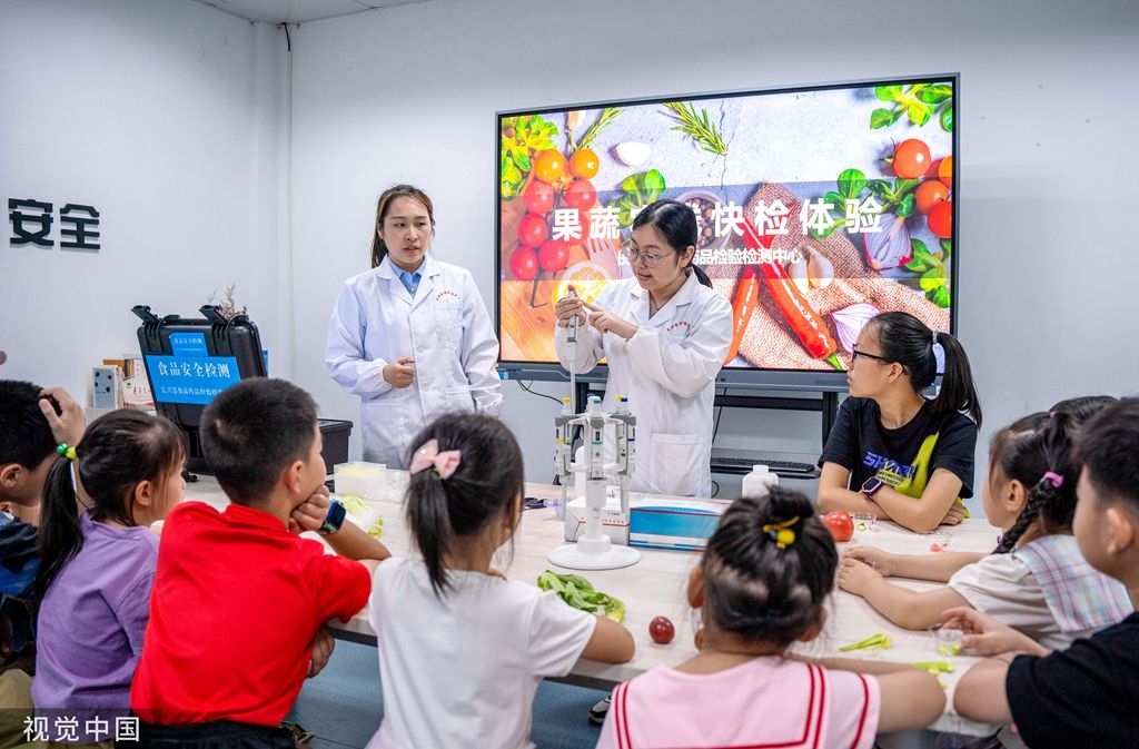 2023年8月11日,浙江湖州,长兴县食品药品检验检测中心实验室,小朋友工作人员指导下进行蔬菜水果中农药残留检测。