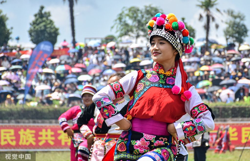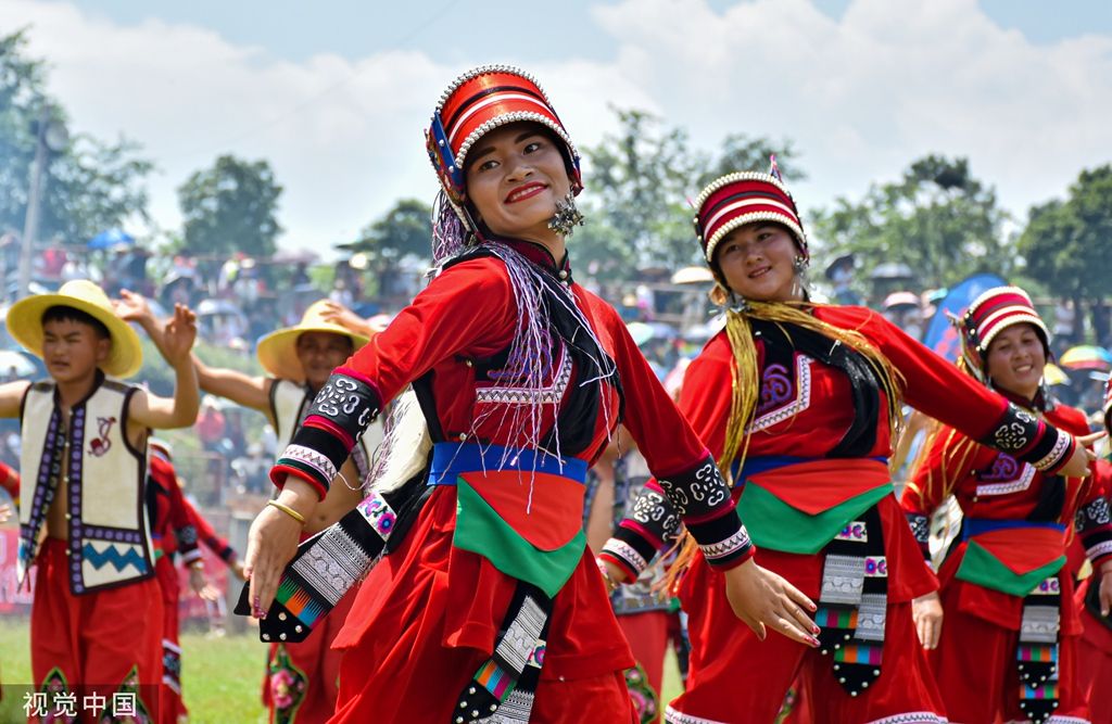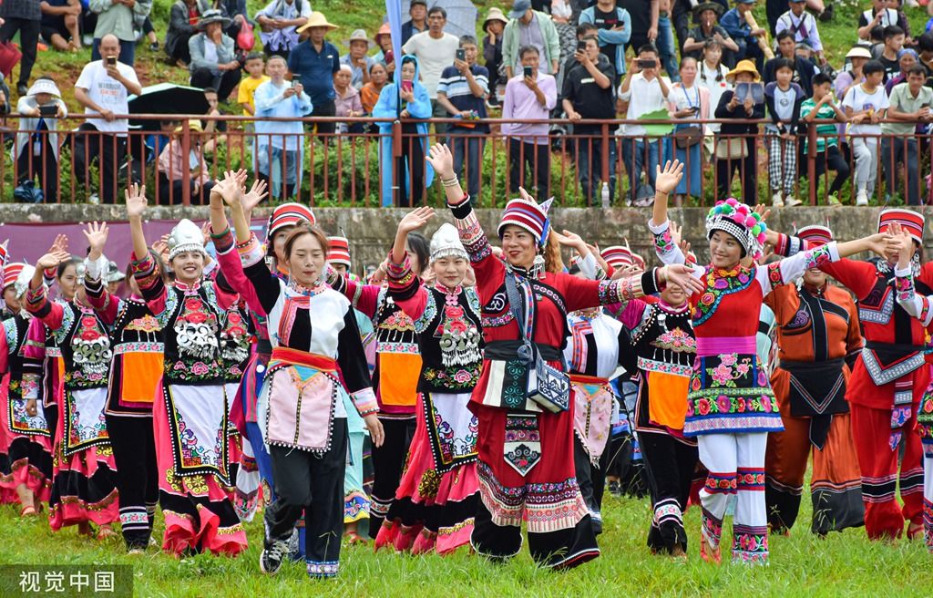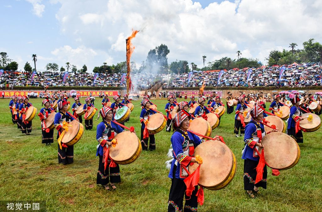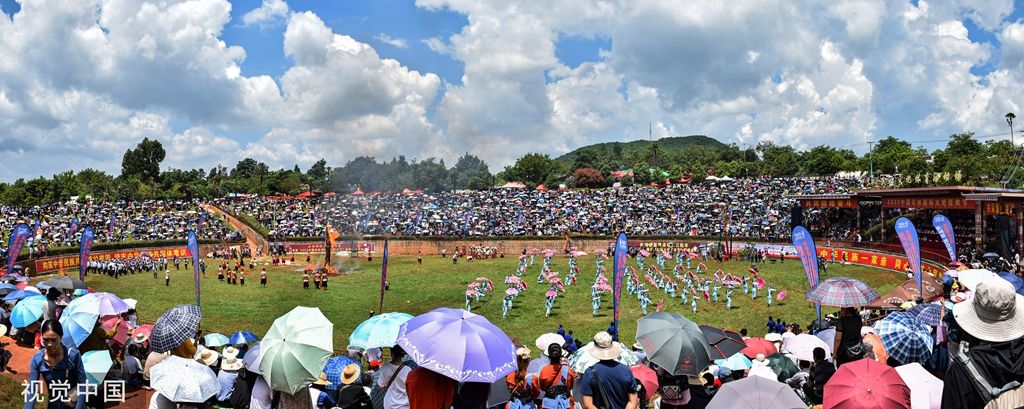 2023年8月10日,昆明,以“激情火把 魅力石林”为主题的2023中国石林国际火把狂欢节盛大启幕。石林彝族群众穿上艳丽的节日盛装欢庆传统火把节。