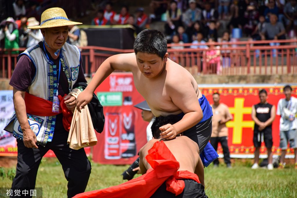 2023年8月10日,昆明,以“激情火把 魅力石林”为主题的2023中国石林国际火把狂欢节盛大启幕。彝族传统摔跤大赛。