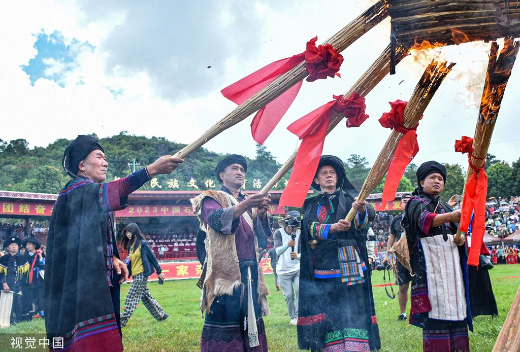 2023年8月10日,昆明,以“激情火把 魅力石林”为主题的2023中国石林国际火把狂欢节盛大启幕。火把节传统点火仪式。