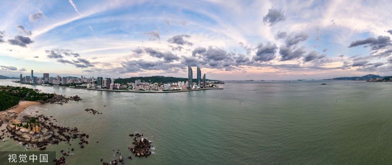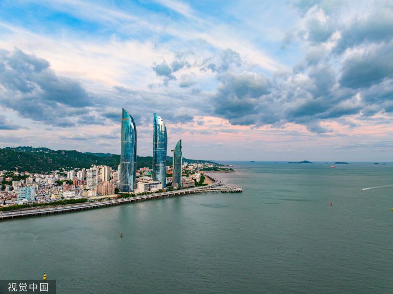 2023年8月30日,厦门,受今年第九号台风苏拉(SAOLA)影响,傍晚演武大桥双子塔附近乌云密布。