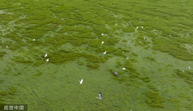 2023年8月30日,江西九江,鄱阳湖都昌矶山附近水域,鹭鸟在水草间栖息觅食。