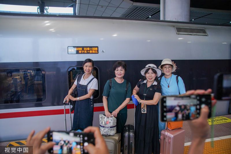 2023年8月31日上午,南宁,G4308次高铁列车从南宁东站发出,这标志着贵阳至南宁高速铁路实现全线贯通运营。该线路的贯通让广西在迈入“时速350公里时代”的同时,实现了市市通高铁动车。乘客出发前拍照留念。 中新社记者 陈冠言 摄