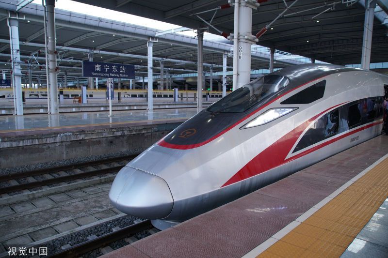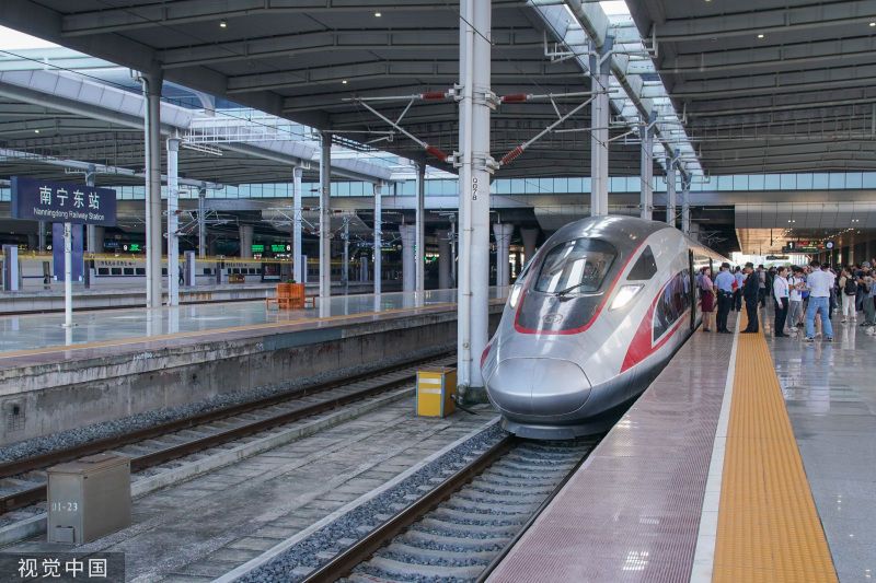 2023年8月31日上午,南宁,G4308次高铁列车从南宁东站发出,这标志着贵阳至南宁高速铁路实现全线贯通运营。该线路的贯通让广西在迈入“时速350公里时代”的同时,实现了市市通高铁动车。 中新社记者 陈冠言 摄