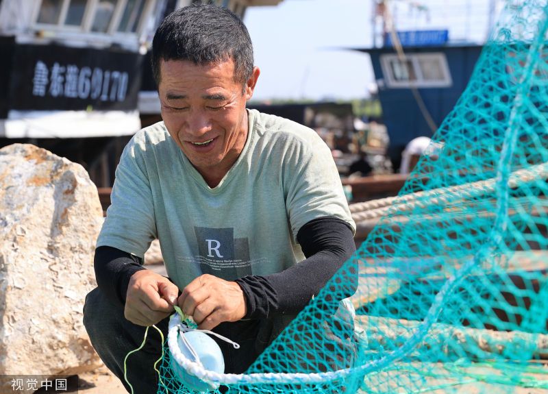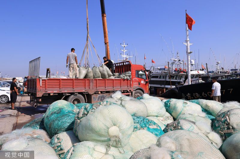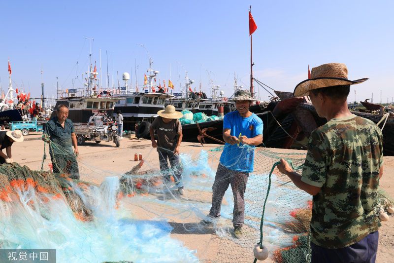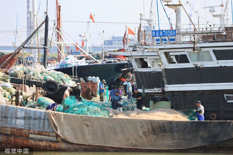 2023年8月30日,山东东营经济技术开发区的广利渔港码头上一片繁忙景象,渔民们忙着检修渔船、修补渔网、添置各种渔具,为开海秋捕作准备。