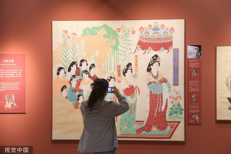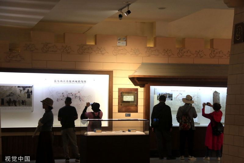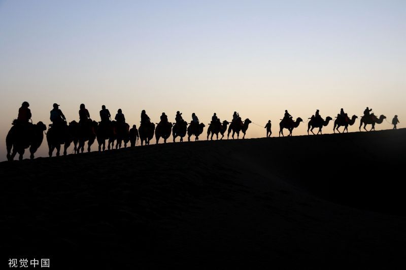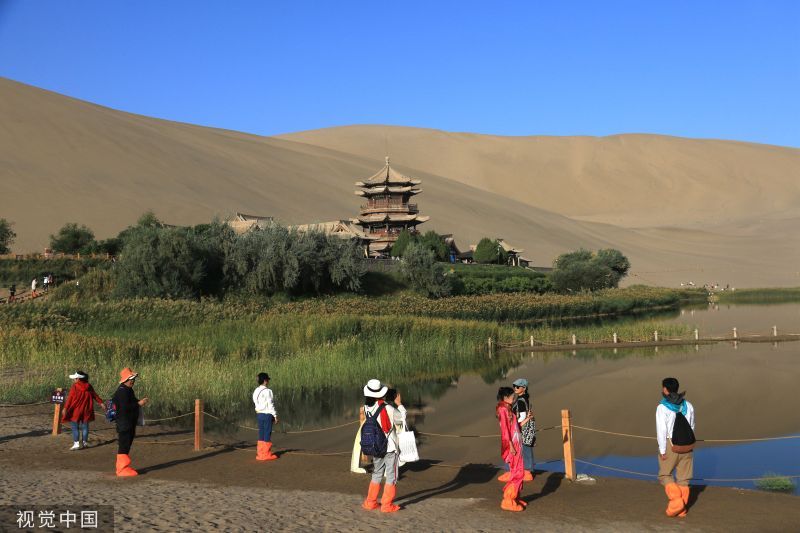 2023年9月10-11日,甘肃酒泉,游客在敦煌国际会展中心、鸣沙山月牙泉景区、阳关景区参观。