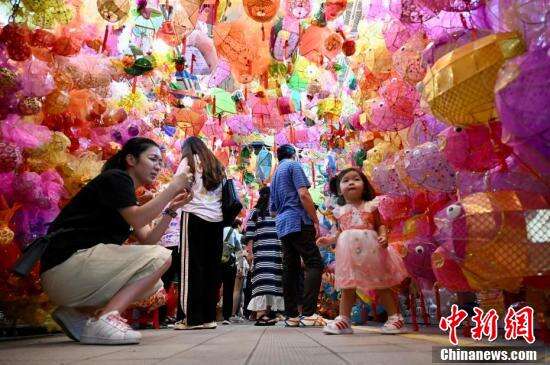 中秋佳节即将到来,9月20日,香港有市民到位于元朗大桥街市的“灯笼街”选购传统灯笼。“灯笼街”现场挂有近千个传统手扎灯笼,吸引不少大人及儿童拍照留念。图为小女孩穿上汉服与传统灯笼合影。