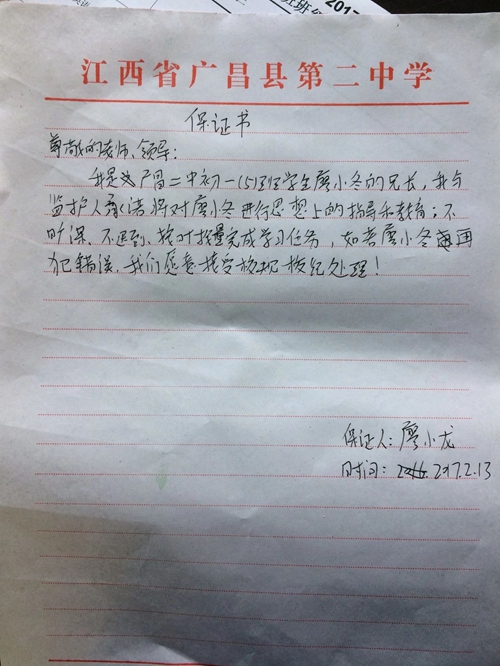 那天,廖小龙签署了人生中的第一份保证书。他还被班主任告知:“你弟弟属于辍学,不好管教,如果他再逃学,出了什么问题,与学校无关。”