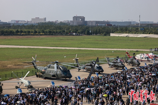 作为共同主办方之一的中国人民解放军陆军,此次展览派出了14型79架(套)装备参展参演。在13万平方米的室外展区,陆军航空兵的作战装备一字排开,包含直-20战术通用直升机、直-10武装直升机、直-19武装直升机、直-8L运输直升机等主力机型,以及航空炮弹、空空导弹、空地导弹等。护栏外的观众探着身子举起手机,只为达到最近距离拍摄,一睹陆航武器装备的风采。
