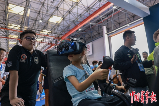 博览会上的中国人民解放军陆军展位,也成了观众驻留时间最长的点位之一。展位上放置了两台米-17直升机模拟训练系统,等待试驾的观众排成长队。一名7岁的女孩戴上VR眼镜,拨动操纵杆,学得有模有样。戴眼镜的小男孩在一旁看得兴致勃勃,主动上前与工作人员“社交”,请求对方让他也试试。