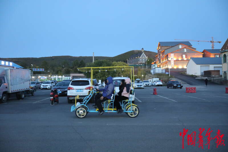 9月22日傍晚,内蒙古兴安盟阿尔山市阿尔山火车站旁,几名游客骑着多人脚踏车经过。孔斯琪/摄