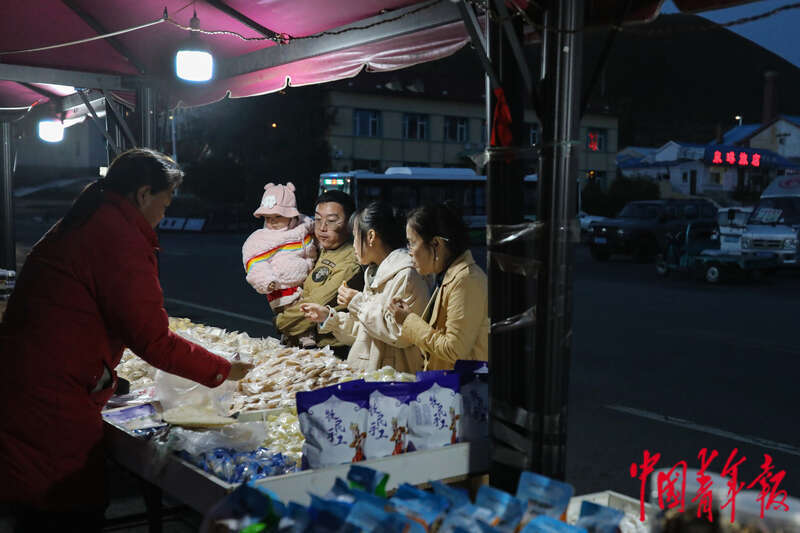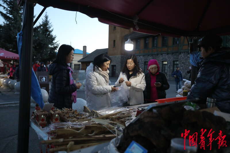9月22日傍晚,内蒙古兴安盟阿尔山市阿尔山火车站旁,游客在一处摊位前品尝当地特产。孔斯琪/摄