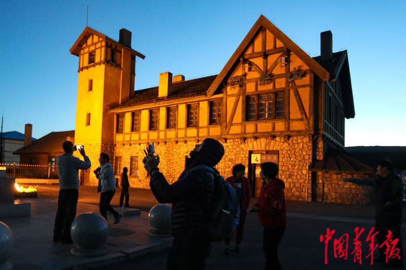 9月22日傍晚,内蒙古兴安盟阿尔山市,一名游客在阿尔山火车站前操作无人机航拍。夜幕降临,山区气温降低,仍有不少游客在这座号称是“中国最小且最美的火车站”前游览打卡。