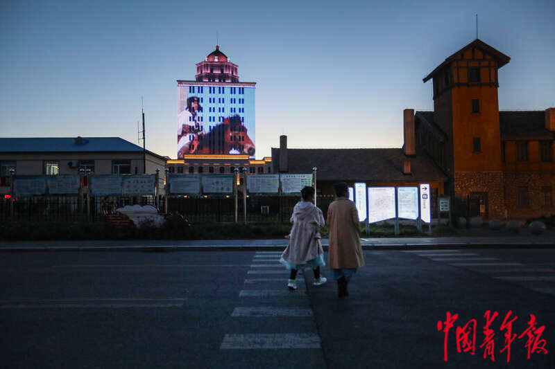 9月22日傍晚,内蒙古兴安盟阿尔山市阿尔山火车站旁,两名游客过马路。远处的一座建筑上投放着边防战士骑马巡逻的影像。孔斯琪/摄