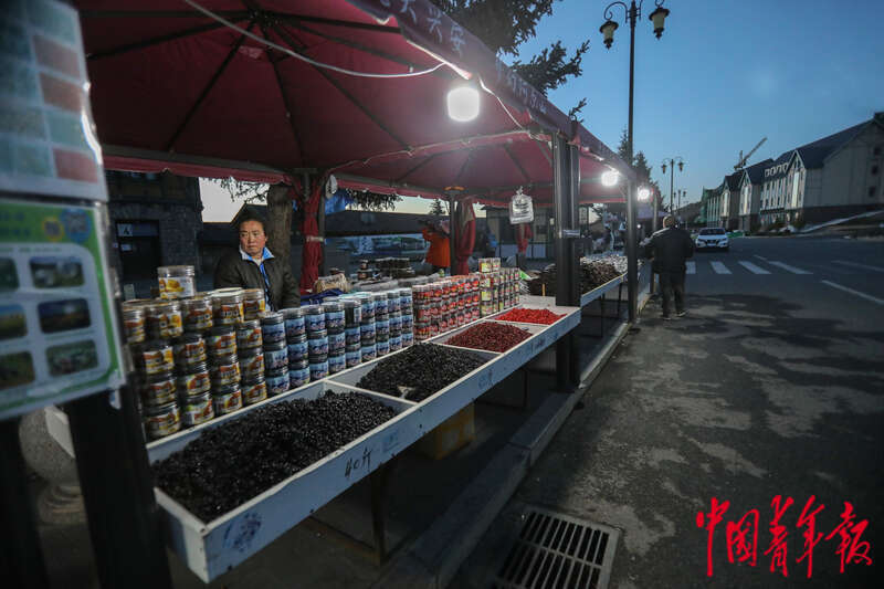 9月22日傍晚,内蒙古兴安盟阿尔山市阿尔山火车站旁,一处摊位在售卖当地生产的果干。孔斯琪/摄