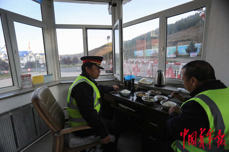 9月23日清晨7点半,内蒙古兴安盟阿尔山市,位于白阿线336公里877米处的阿尔山北道口,道口员严志刚(左)和张福忠在吃早餐,饭后二人将进行交接班。这个道口距离阿尔山火车站仅几百米,虽然每天经过的火车不多,他们仍需24小时维护经过道口的车辆和行人的安全。疫情放开后,今年阿尔山的游客也多了起来,常常有游客来道口的岗亭问路,严志刚还要“兼职”导游,给游客答疑解惑,劝阻在火车道口停留打卡的行人。不过今年52岁的他“乐在其中”,常常与来自天南海北的游客“唠”上几句。孔斯琪/摄